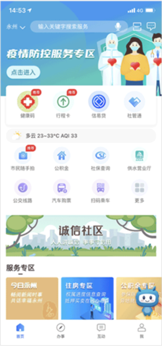 我的永州作为永州市行政审批服务局倾力打造的数字化民生服务平台,深度融合了政务服务与城市生活服务,为永州市民开启智慧生活新篇章。依托永州市"互联网+政务服务"平台的强大支撑,该应用不仅实现了"一网通办"的高效服务模式,更通过精准对接市民需求,构建起政府与民众之间高效沟通的桥梁,让政务服务真正走进千家万户