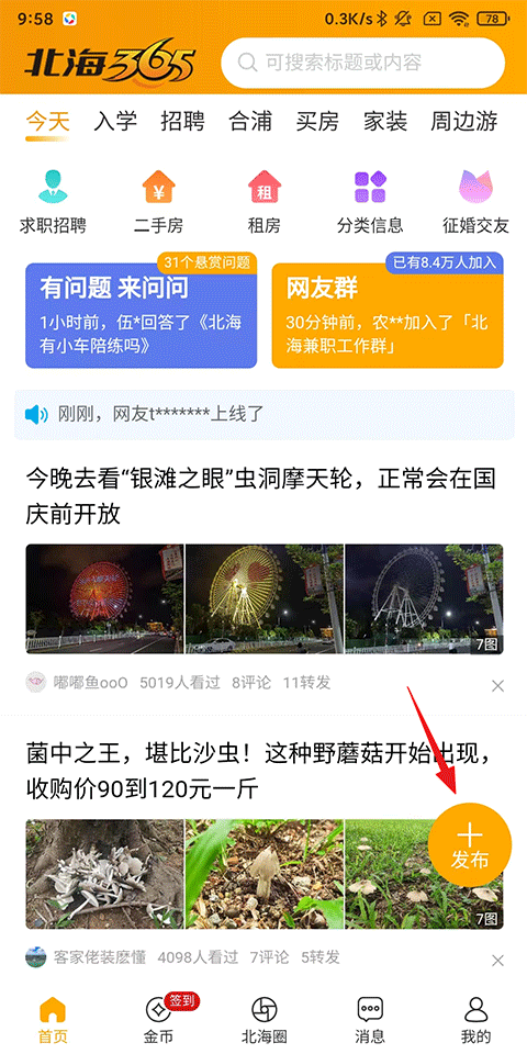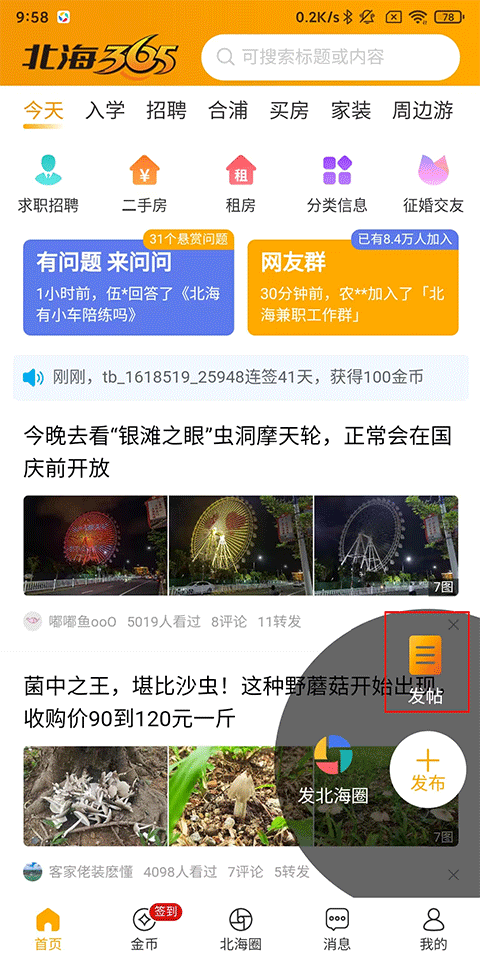 1、打开北海365APP,点击首页-发布按钮;