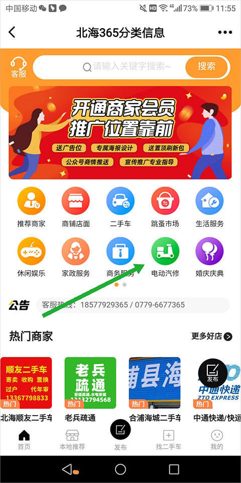 1、进入【首页】点击【电动汽修】(下图绿色箭头所指区域,注意不是【二手车】)