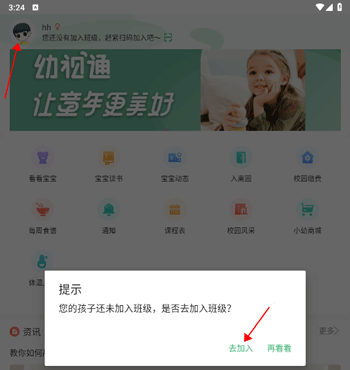 1、打开幼视通app,添加宝宝后,点击左上角的头像,接着点击“去加入”;