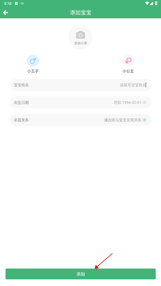 1、打开软件注册登录后,在“成长”界面点击“添加宝宝”