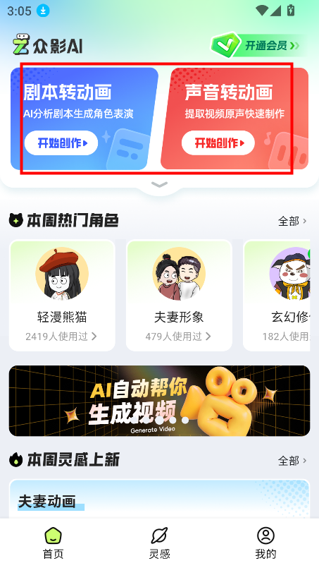 3.到达首页我们就可以看到AI剧本转动画,声音转动画的功能