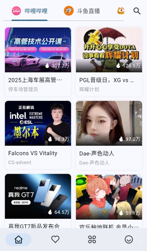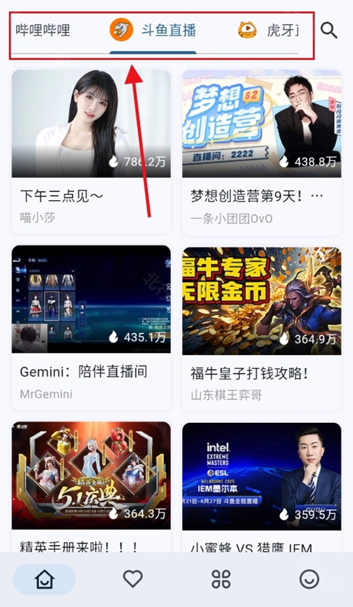 2、左右滑动屏幕,可以切换当前的直播平台,能够在哔哩哔哩、斗鱼、虎牙和抖音四个直播平台间来回切换