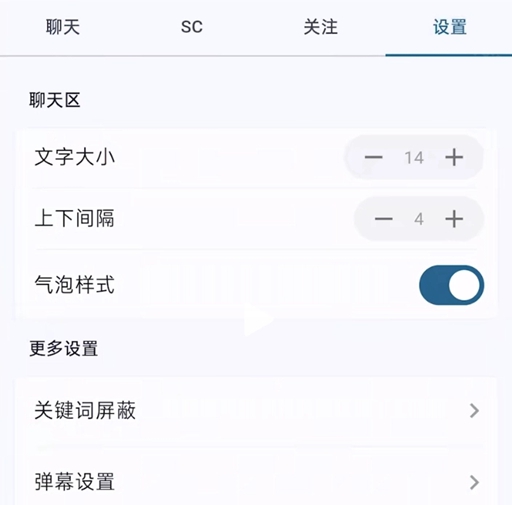 4、在直播间的【设置】中还能切换聊天区的文字格式和直播画面的弹幕样式