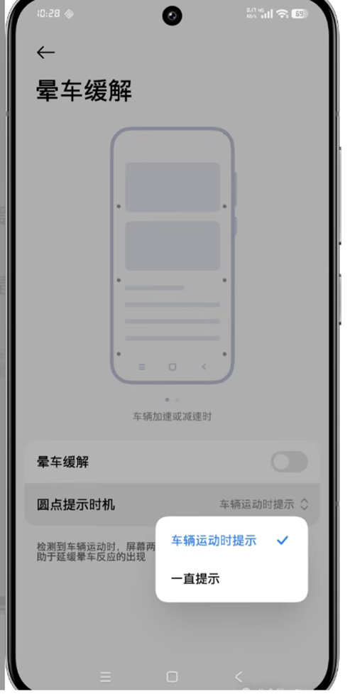 这项功能专为缓解乘车时低头刷手机(如看视频、聊社交软件)引起的轻微晕车而设计,它利用视觉同步原理来减少大脑接收到的混乱信号。实际体验表明,大部分用户在开启后,头晕不适感都有所改善。快来试试吧