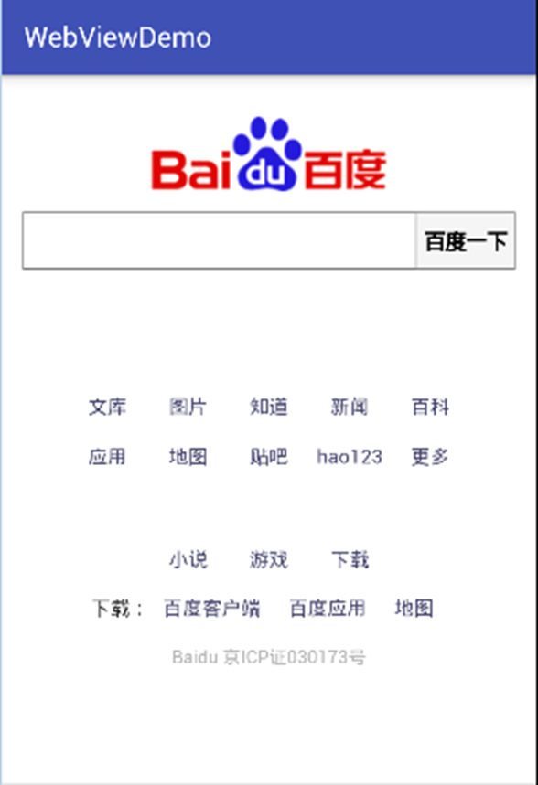 下面我们直接讲解使用WebView控件显示百度首页的网页内容的案例: