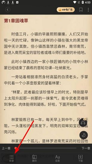 1.在小说阅读模式下,调出菜单栏,可以在左下角发现【目录】