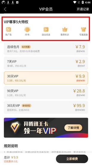 2.关闭广告是一个十分现实的问题,那就是需要充值成为VIP会员,只要成为了会员,就可以免除广告了,具体的会员价格已在下图显示,如果不想要充值会员,就只能忍受广告干扰,唯一庆幸的是,广告只存在最下方,并不影响用户正常阅读小说内容,还是还是可以忍受。