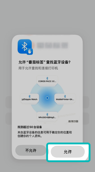 1、打开APP后,手机提示软件搜索蓝牙设备权限,请点击"允许