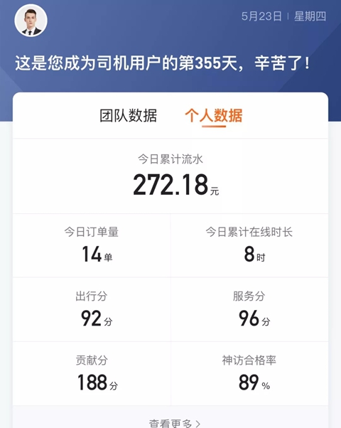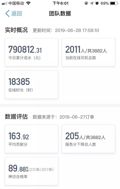 [团队数据]:查看今日累计流水、当前在线司机数、今日累计在线时长、平均服务分等;