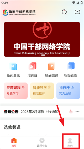 1、在本站下载安装并打开海南干部网络学院app,进入首页后点击我的。