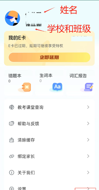 01检查班级登录后,找到最下方菜单栏点击最右边图标——“我的”可以查看到学生的姓名、学校、班级请认真核对是不是自己的账号(如下图)