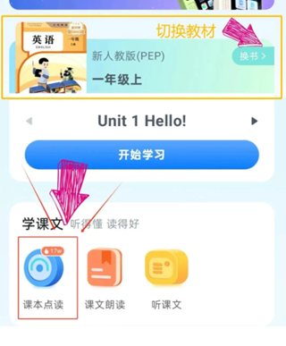 查找路径:E听说小学首页——选教材——课本点读(如下图)