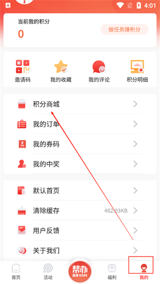 1、点击【我的】,选择【积分商城】