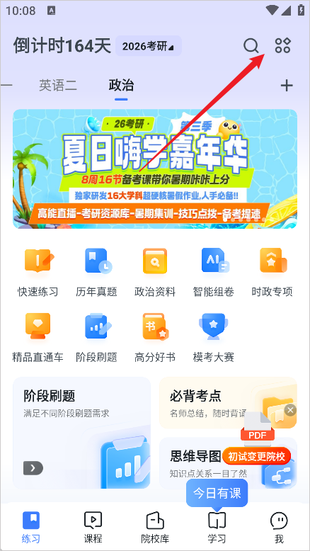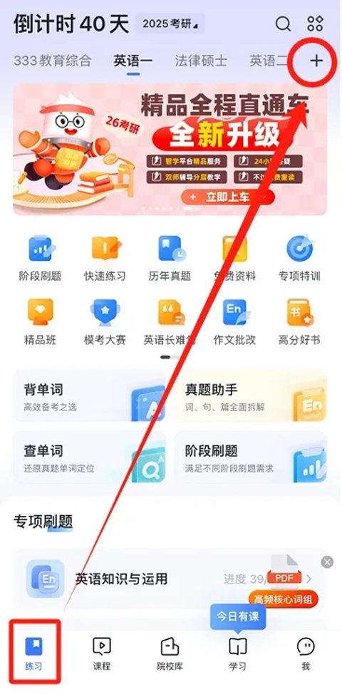 打开粉笔考研APP,在练习页面,点击右上角“+”号