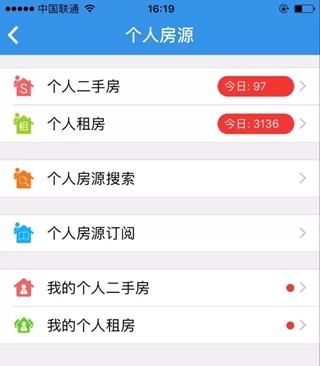 登录进去之后,从外网上采集的个人房源信息在【发现】里面:第二个【个人房源】我们进去看下。采集的房源我们分为租房和二手房,当然房源的类型主要就是住宅,写字楼和商铺了。这个界面前面的两项,个人二手房和个人租房,就是采集过来的全部房源信息了,上面的数字显示是指截止到目前为止采集的房源数量。