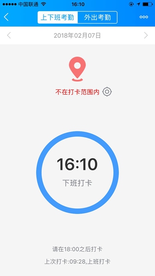 然后,我们看一下这个外出考勤,比如说这天你出去过户了,那怎么能保证你今天是出去过户了,你所在的地点,会自动进行定位——可以看到界面上方会直接显示了定位的位置信息。