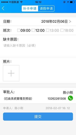 同样,【请假申请】,可以针对今天之后的时间提前提交一个请假申请,提交之后同样管理员在【考勤审批】里面也可以进行审批。