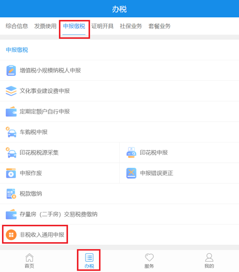 登录厦门税务APP,点击【办税】-【申报缴税】-【非税收入通用申报】。