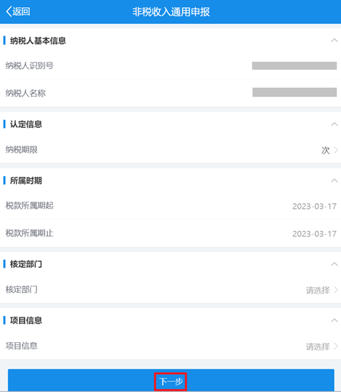 进入非税收入通用申报界面,点击【下一步】。