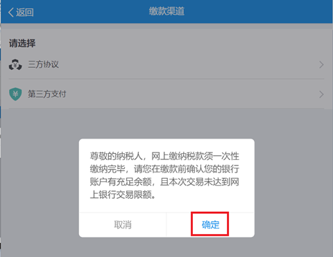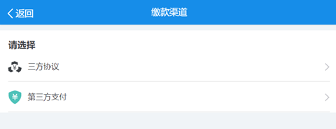 缴款渠道可选择“三方协议”或“第三方支付”。