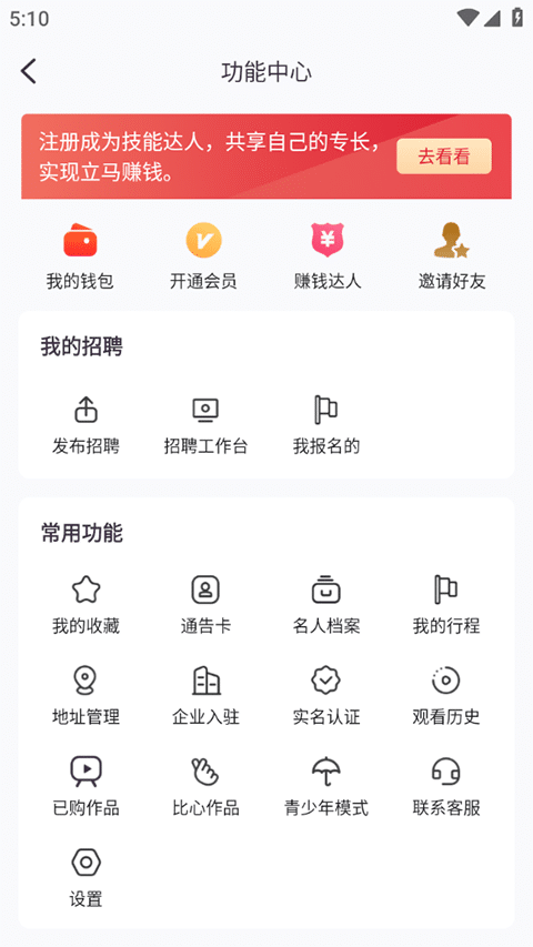 4、点击“我的”,然后再点右上角三个点,进入软件的功能中心,多种软件功能聚集于此,同时用户可以在这查看钱包明细以及多种赚钱