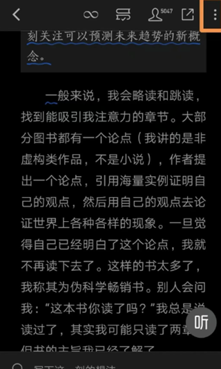 第一步,点开想自动阅读的书,双击文档,会出来部分菜单。最右上角有三个竖着的小点,点击进去。