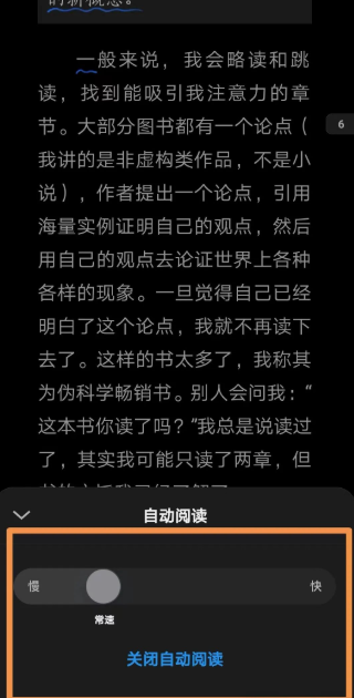 第五步,拉动速度条,即可调整速度。如果想退出,点击“关闭自动阅读”即可。