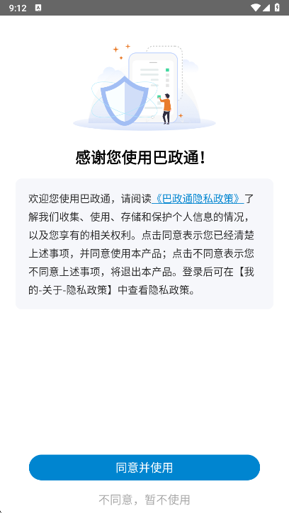 1、打开后选择同意巴政通app的用户协议