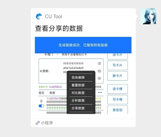 接收他人分享:1、主页0扇区右上角冒号菜单里有导入分享,该功能可使小程序打开各类第三方软件分享到聊天窗口的数据文件,主要包括:JSON格式数据,该格式常用于Proxmark3和Chameleon GUI,后缀名为json、json5;Bin二进制格式数据,该格式常用于Proxmark3,libnfc,NFC Tool,后缀名为bin、mfd、dump;eml格式数据,该格式常用于Proxmark3,后缀名为eml;MCT文本格式,该格式常用于Mifare Classic Tool,NFC Tool,该格式是文本文件,可读性强,推荐使用,后缀名为mct、txt.
