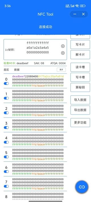 编辑:1、主页点击扇区数据可直接进行编辑;2、主页0扇区右上角冒号菜单里有自由编辑,该功能也可接收MCT数据;