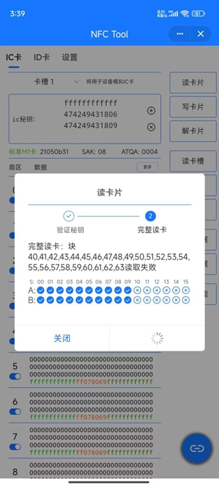 App在解码过程中会生成以卡号命名的密钥文件,如果因为控制字原因导致获取dump失败,此时密钥依然是完整有效的,你可以在一键读写界面直接读卡获取完整dump。