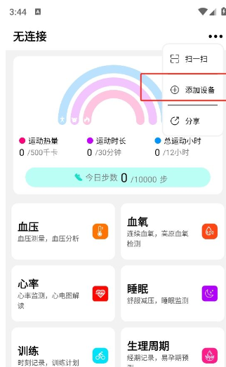 1.打开APP--设备,点击”添加设备”,点击右上角扫描图标(如上图一),扫描手环上的二维码即可配对。