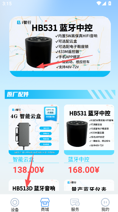 1、i智行搭配电动车实体产品,在此大家可以选择各类原厂配件查看价格以及其他的详情部分。