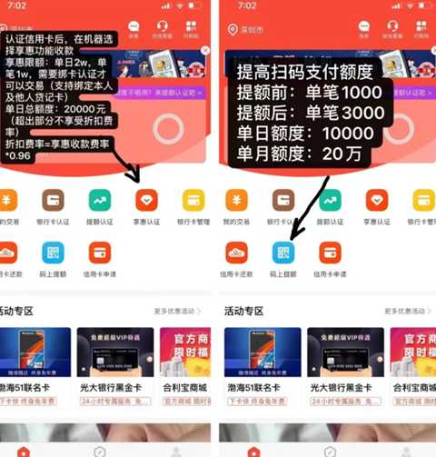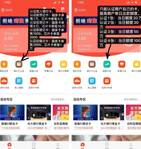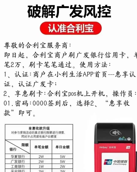 合利宝芯片卡单笔5万以内,磁条卡单笔1万以内不需要认证,直接刷,超过1万需要在小利生活app银行卡认证添加