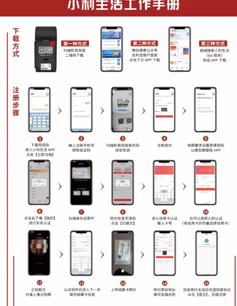 第一步:下载小利生活APP,或者微信小程序合利宝支付管家--注册并登陆--扫码绑定机器--实名认证上传身份证、银行卡照片