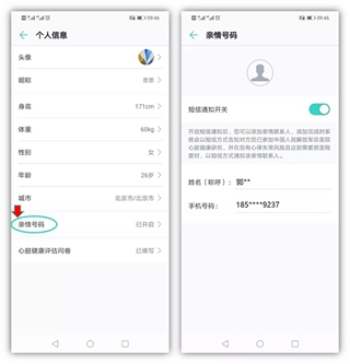 点击“我的>个人信息>亲情号码”设置亲情联系人。
