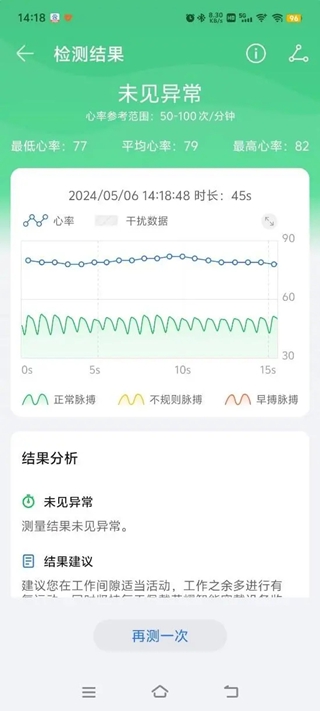 正确佩戴设备,进入APP首页,点击“开始检测”,稍等片刻(45s)即可出测量报告。特别是在突感心慌、心悸、胸闷时,可以帮助快速捕捉心律失常现象,了解心脏健康状况。