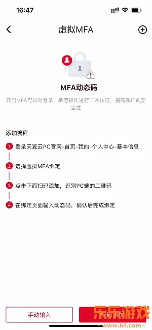 天翼云App支持用户通过扫码添加或手动输入两种方式绑定MFA。