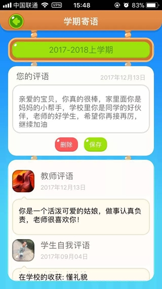 学期末,学生完成自我评语,家长完成家长评语
