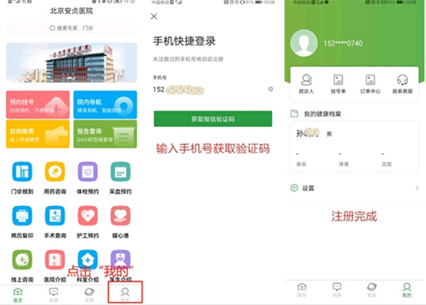 点击APP首页右下角进入我的页面,然后输入手机号获取验证码,填写验证码完成注册。