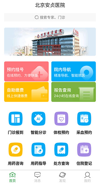 APP支持预约挂号、门诊报到、检查预约、费用支付、报告查询等基础功能,与微信小程序“北京安贞医院智慧服务平台”功能基本一致。