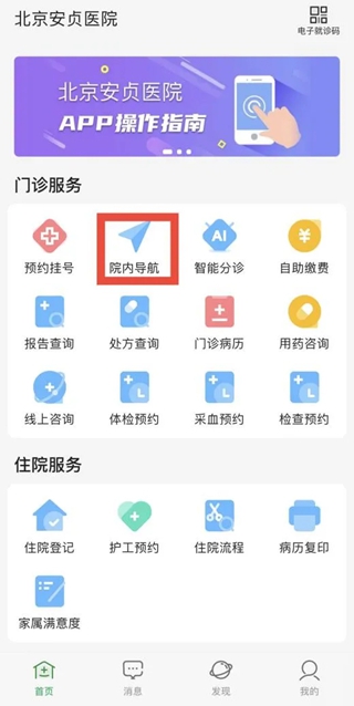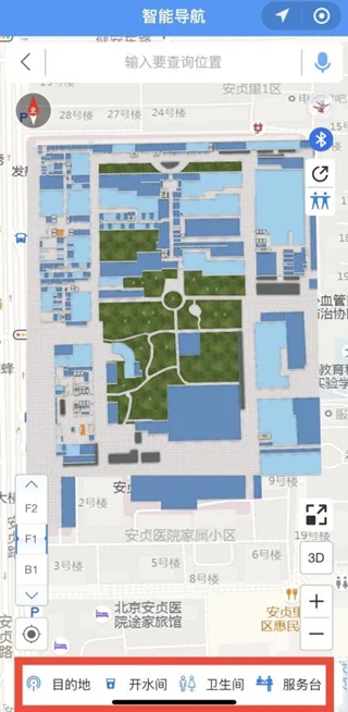1、打开手机蓝牙在安贞医院APP或微信小程序首页点击“院内导航”