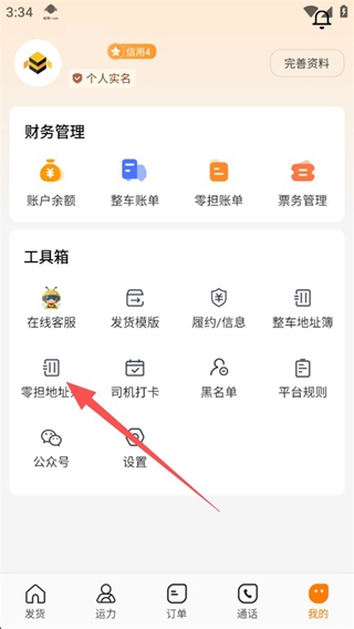 2、在我的页面,点击工具箱中的"零担地址";