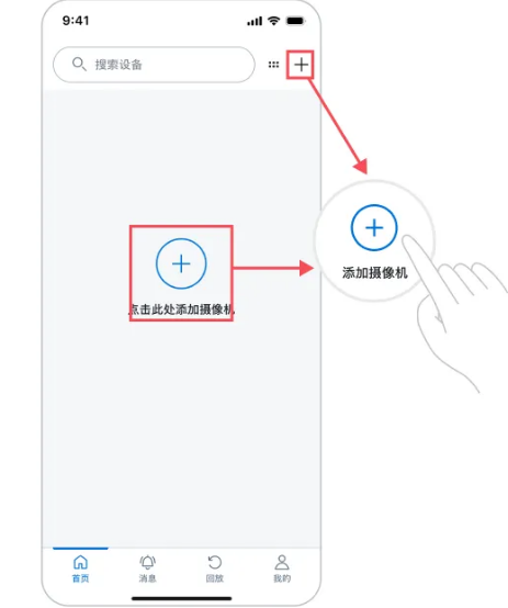 进入“飞利浦家庭摄像机”APP通过手机号码/邮箱注册客户端,如已注册,请直接登录。在APP首页点击“+”号添加摄像机。