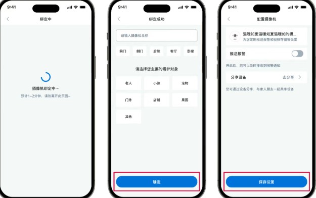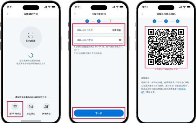 操作步骤:摄像机接通电源,手机连接上Wi-Fi,等待摄像机发出配网通知后按以下所示操作。