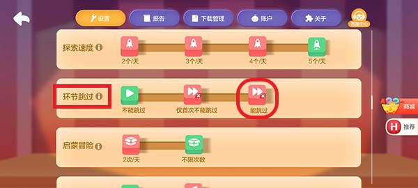 3、成功进入到设置界面,往下滑动屏幕找到“环节跳过”选项,点击此选项右侧的“能跳过”按钮即可成功设置跳过环节