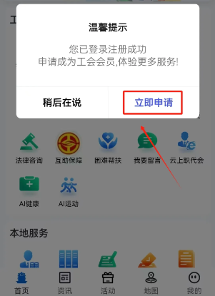 1、在首页点击“登录/注册”后授权,注册成功后点击“立即申请”成为工会会员。