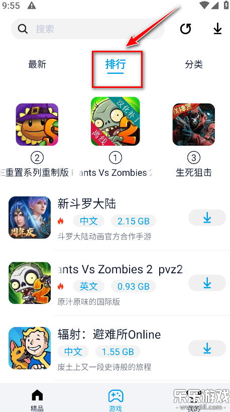 3.点击排行,会出现游戏排行榜单。