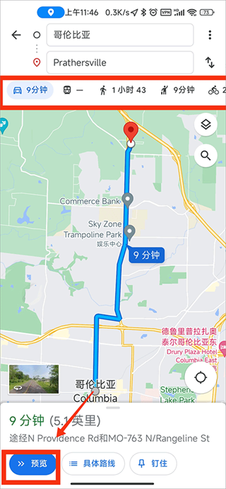 3、搜索后会为你呈现驾车、公交地铁、步行、骑行这四种路线方案,可以根据自己的需求进行选择,选择合适的方案后,并在路线中点击下方的预览